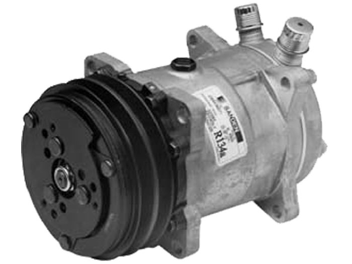 This is a air conditioning compressor is a non-polished Sanden for R-134A refrigerant. Vertical O-ring, 2-groove v-belt pulley-clutch.