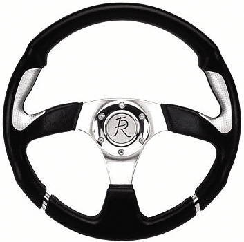 This is a Flaming River Nova fiber black and silver sporty 3 spoke design with black Italian leather with a 6 bolt mounting flange. Aluminum (satin and polished)