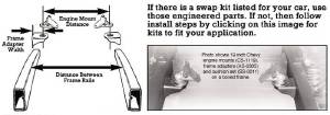 The kit includes bolt on frame adapters (or can be welded on), Chassis Engineering engine mounts, thru bolt cushion set, bolts and instructions. easy to install.
