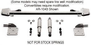 This is a rear shock kit that includes upper shock bar, 2 shock absorbers, 2 lower spring plates, shock mounts and all needed bolts and instructions. Convertibles require modification. Some models may require spare tire well modification also.