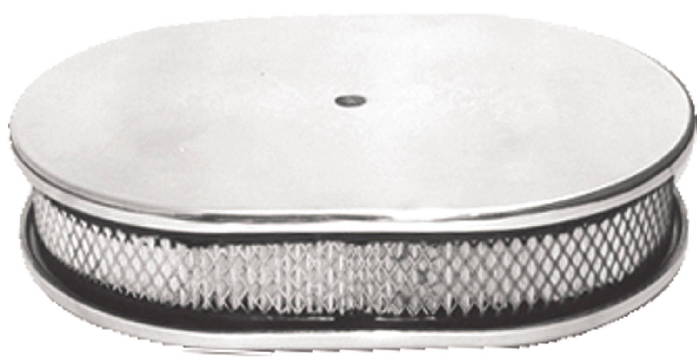 This is a polished aluminum oval air cleaner that measures 12 inches x 2 inches tall. The top is smooth. Includes a replaceable paper air filter element.