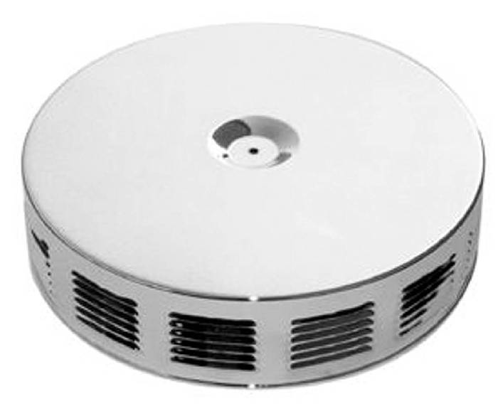 This is a chrome round louvered air cleaner. It measures 14 inches x 3 inches tall. The base is offset. Includes a paper air filter element.