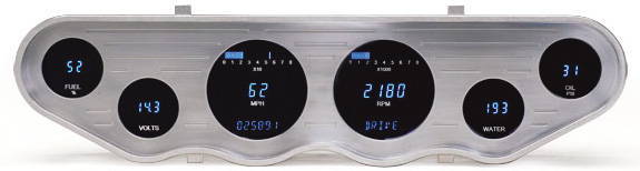 Speedo (0-255 MPH or KPH-programmable for any tire/ gear combination), Tach, Oil Pressure, Water Temp, Voltmeter, Fuel Level