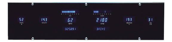 Speedo (0-255 MPH or KPH-programmable for any tire/ gear combination), Tach, Oil Pressure, Water Temp, Voltmeter, Fuel Level