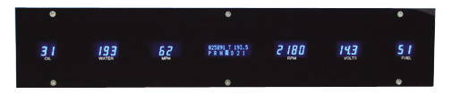 Speedo (0-255 MPH or KPH-programmable for any tire/ gear combination), Tach, Oil Pressure, Water Temp, Voltmeter, Fuel Level