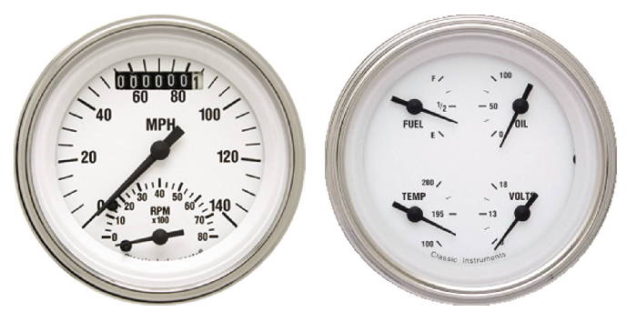Instrument Gauges - Ultimate Speedometer (3-3/8") Speedo Tach Combo With Quad Gauge - White Hot Series With Flat Lens 12v