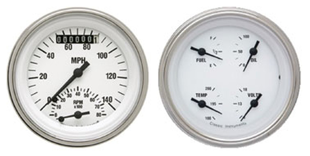 Instrument Gauges - Ultimate Speedometer (3-3/8") Speedo Tach Combo With 4 Gauges - Classic White Series With Flat Lens 12v