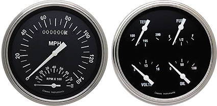 Ultimate Speedometer Series gauges are 3-3/8" dia., SpeedTachular Series gauges are available as an individual 4-3/4" gauge or together with either two 3-3/8" dual gauges, a 4-3/4" Quad or four 2-1/8" gauges (Fuel, Temp, Volt, Oil).